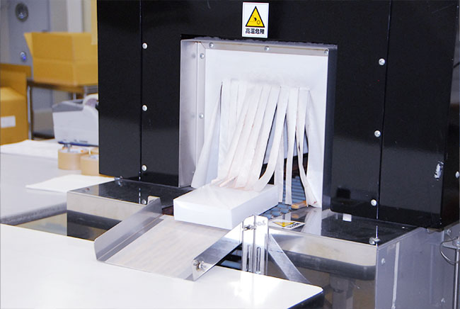 フィルムで覆った製品が、遠赤外線熱風機にて、熱収縮されます。